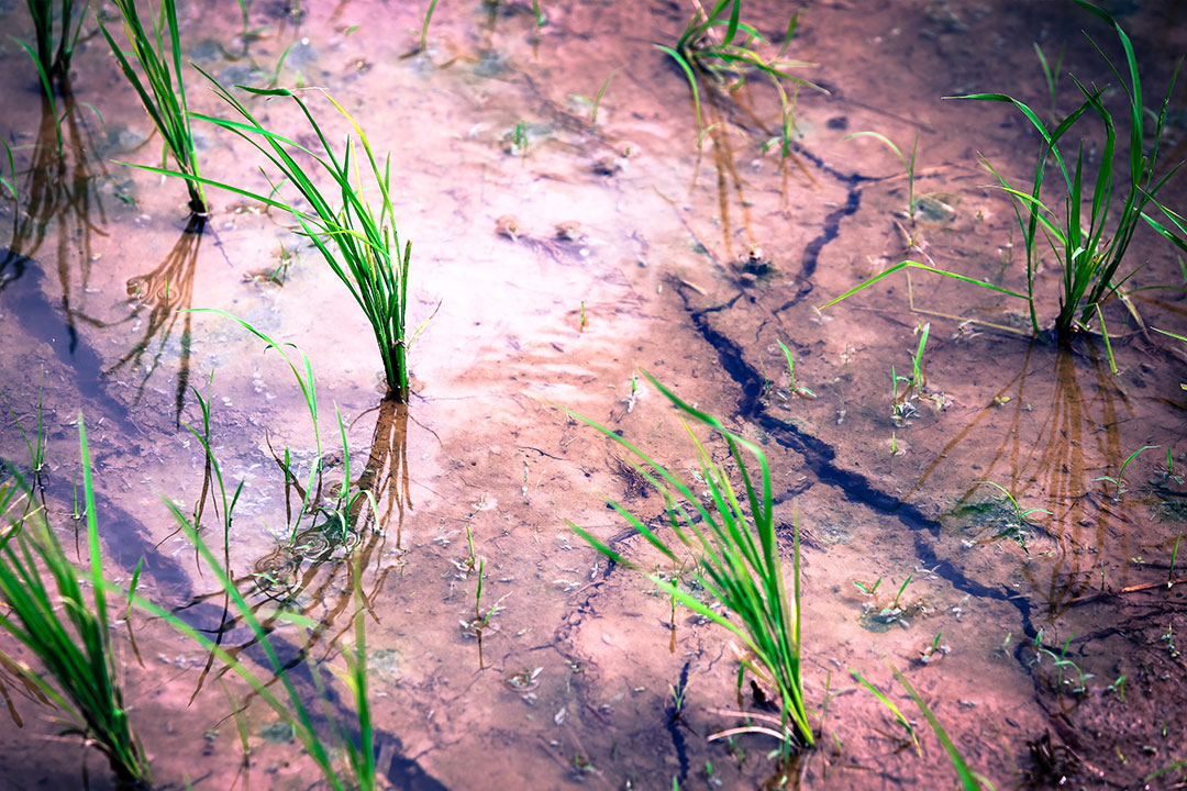 A man and a woman working in the hottest sun of the day are replanting rice seedlings. They tell us that a banana plantation has been established upstream on the river. By January, when they would normally plant their second season of rice, the plantation had taken the water away.