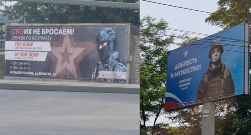 러시아 정부는 전장에 투입할 병력이 부족하자 도시와 농촌 등지에서 군에 입대할 것을 독려하는 징집포스터 현수막을 설치했다. 이 사진은 블라디보스토크와 나홋드카 일대에 설치된 군 징집 광고 중 일부. /RFA PHOTO