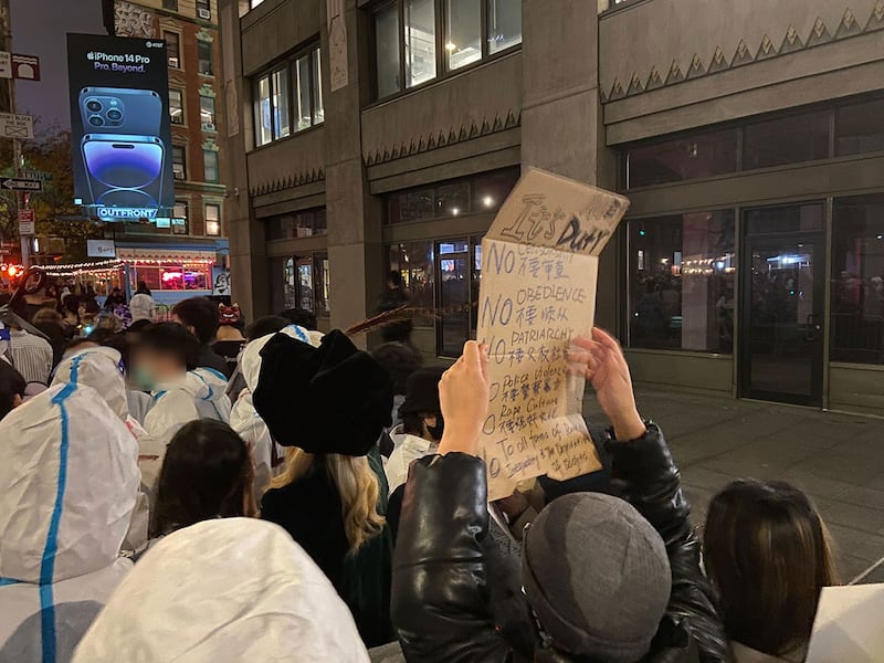 他们举着标语,比如,中英文版本的“罢课罢工罢免独裁习近平”。这显然是受到中共二十大之前,北京四通桥上那位孤身抗议人士的影响。但他们还有更多的诉求,比如“自由中国”,“支持香港”,“释放政治犯、还人民自由人权”等等。